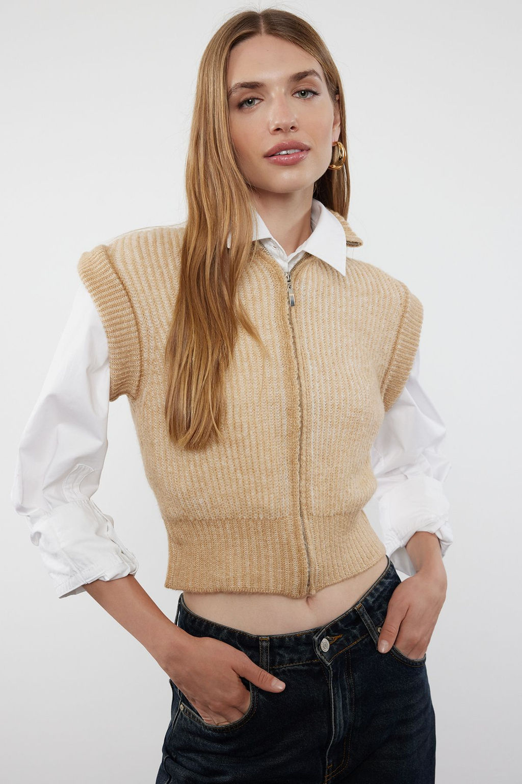 Bej Yumusak Dokulu Dik Yaka Fermuarl? Regular Yelek TWOAW25YE00033