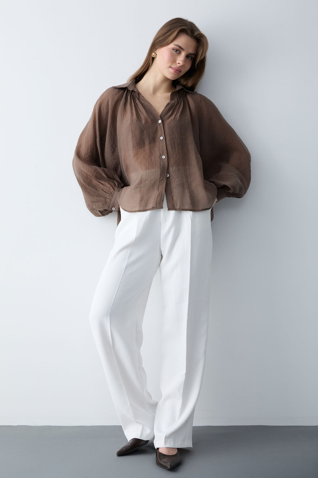 Kahverengi Ince Dokumlu Balon Kol Dokuma Gomlek TWOSS26GO00139