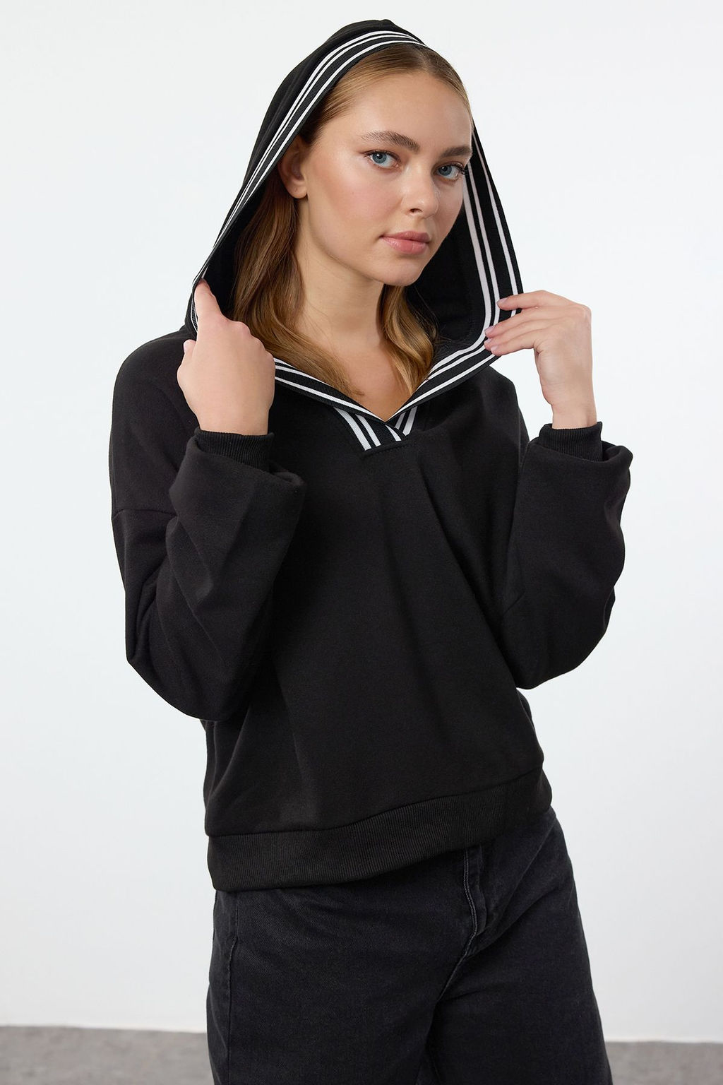 Siyah Overize Kal?p Kal?n Ici Polarl? Kapusonlu Triko Bant Detayl? Orme Sweatshirt TWOAW25SW00144