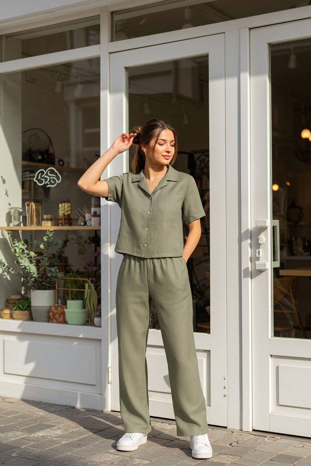 Haki Modal Yumusak Tuseli K?sa Kollu Gomlek Genis Paca Pantolon Dokuma Alt-Ust Tak?m TWOSS25AU00026