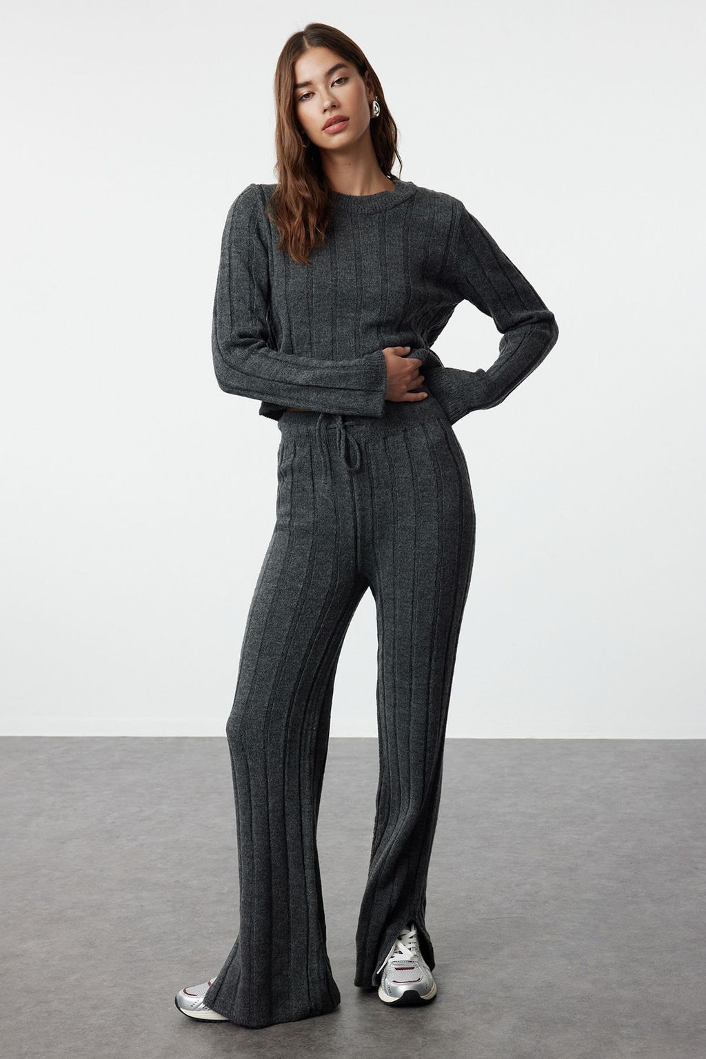 Antrasit Crop Yumusak Dokulu Triko Alt-Ust Tak?m TWOAW25AU00038
