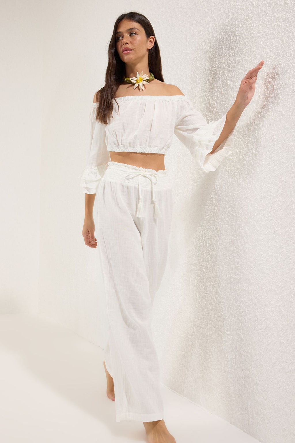 Plaj Giyim %100 Pamuk Ekru Dokuma Volanl? Yuksek Bel Bluz-Pantolon Tak?m TBESS25AU00107