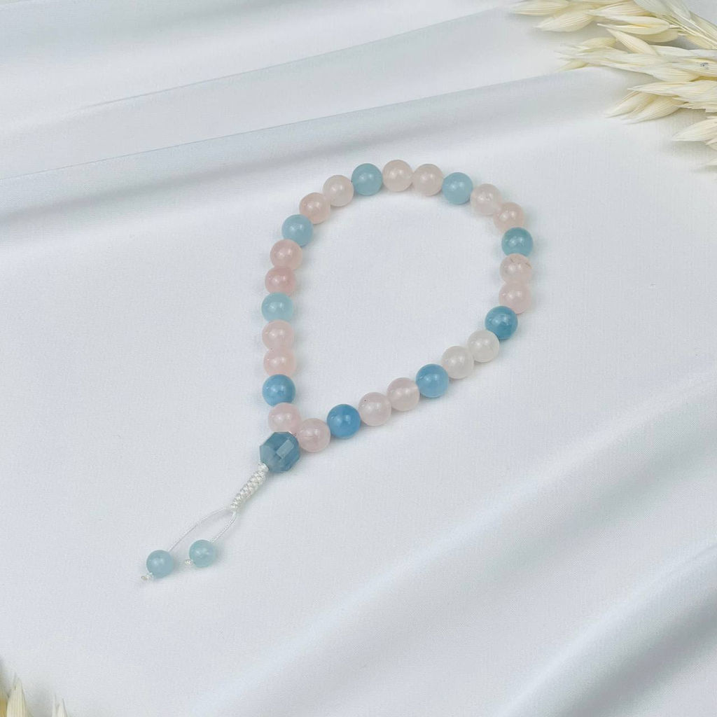 Четки буддийские "мала" из мадагаскарского Розового кварца и Аквамарина (27 бусин)