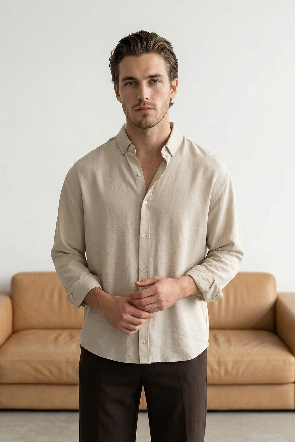Krem Keten Dokulu Uzun Kollu Yar? Oversize Erkek Gomlek TMNSS26GO00036