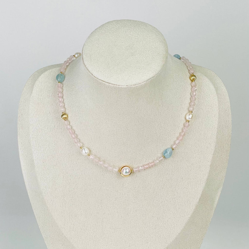 Колье из Розового кварца, Аквамарина и Жемчуга