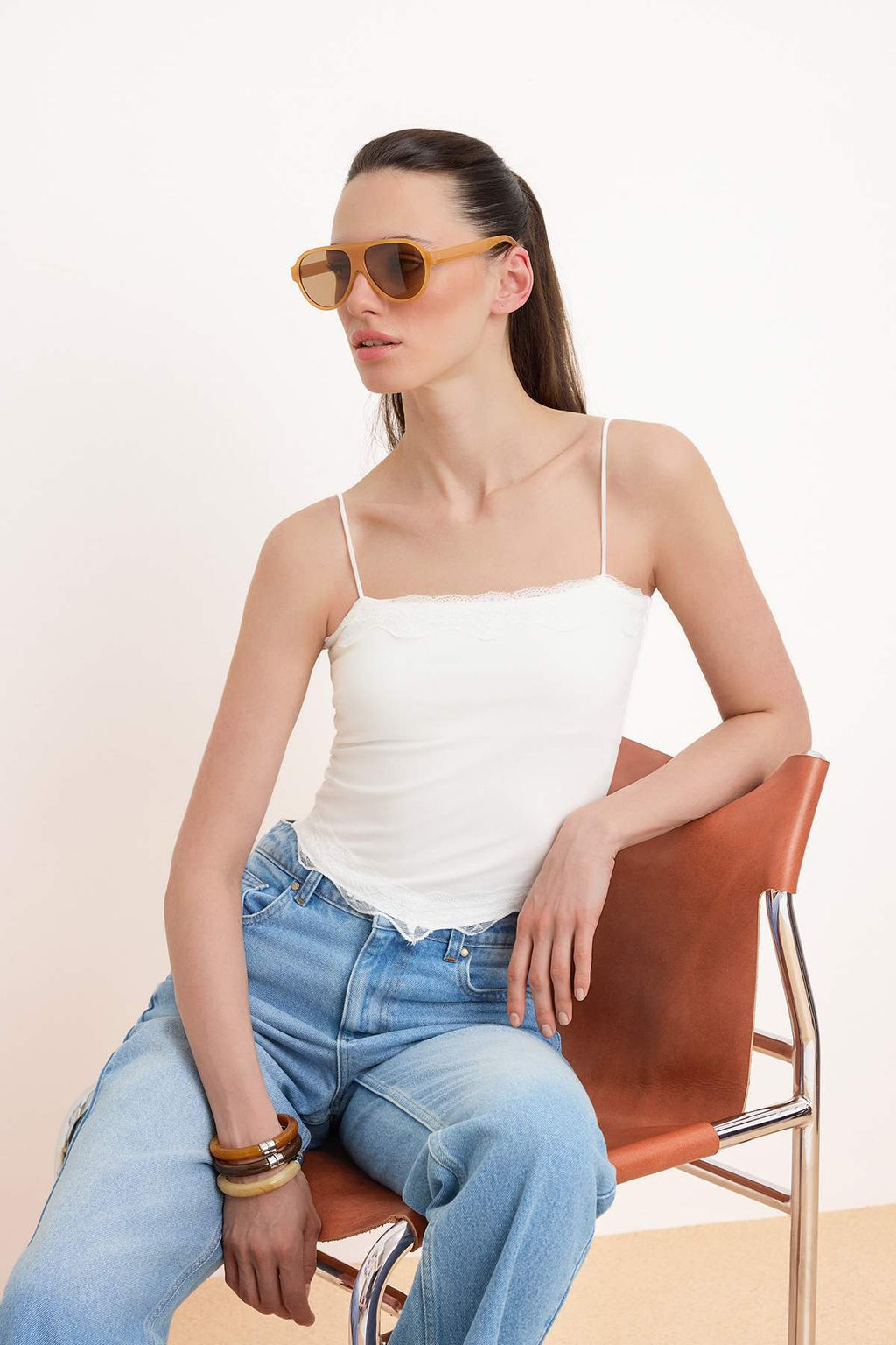 Ekru Fitted/Vucuda Oturan Ask?l? Straplez Dantel Detayl? Pamuklu Esnek Orme Atlet TWOSS26AL00049