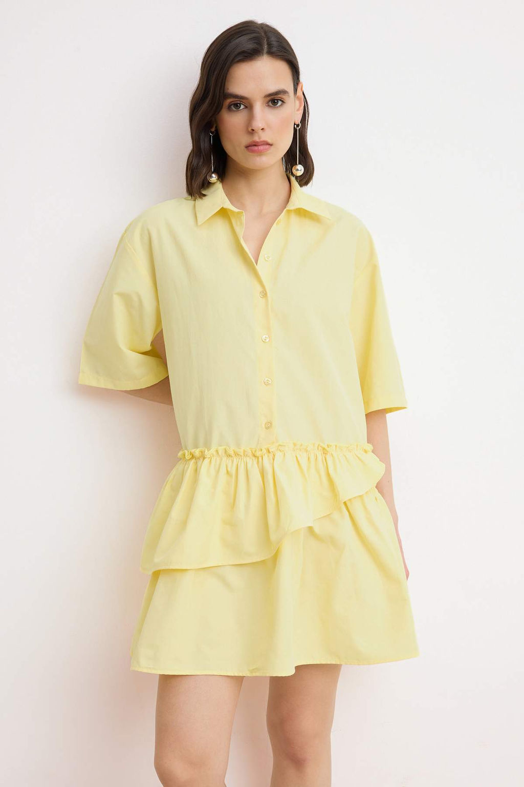Ac?k Sar? Etek Detayl? Dokuma Gomlek Elbise TWOSS26EL00442
