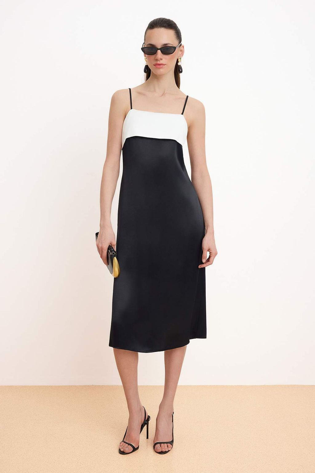 Siyah-Beyaz Renk Bloklu Saten Midi Dokuma Elbise TWOSS26EL00325