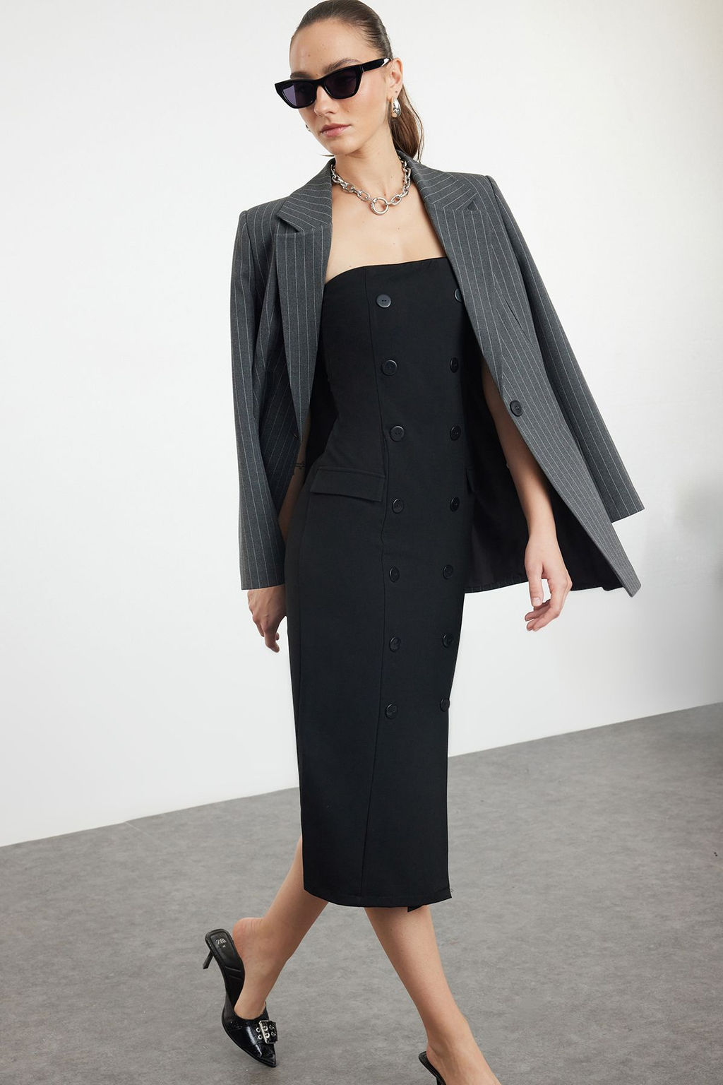 Siyah Duz Kesim Dugme Detayl? Straplez Midi Dokuma Elbise TWOAW24EL00418