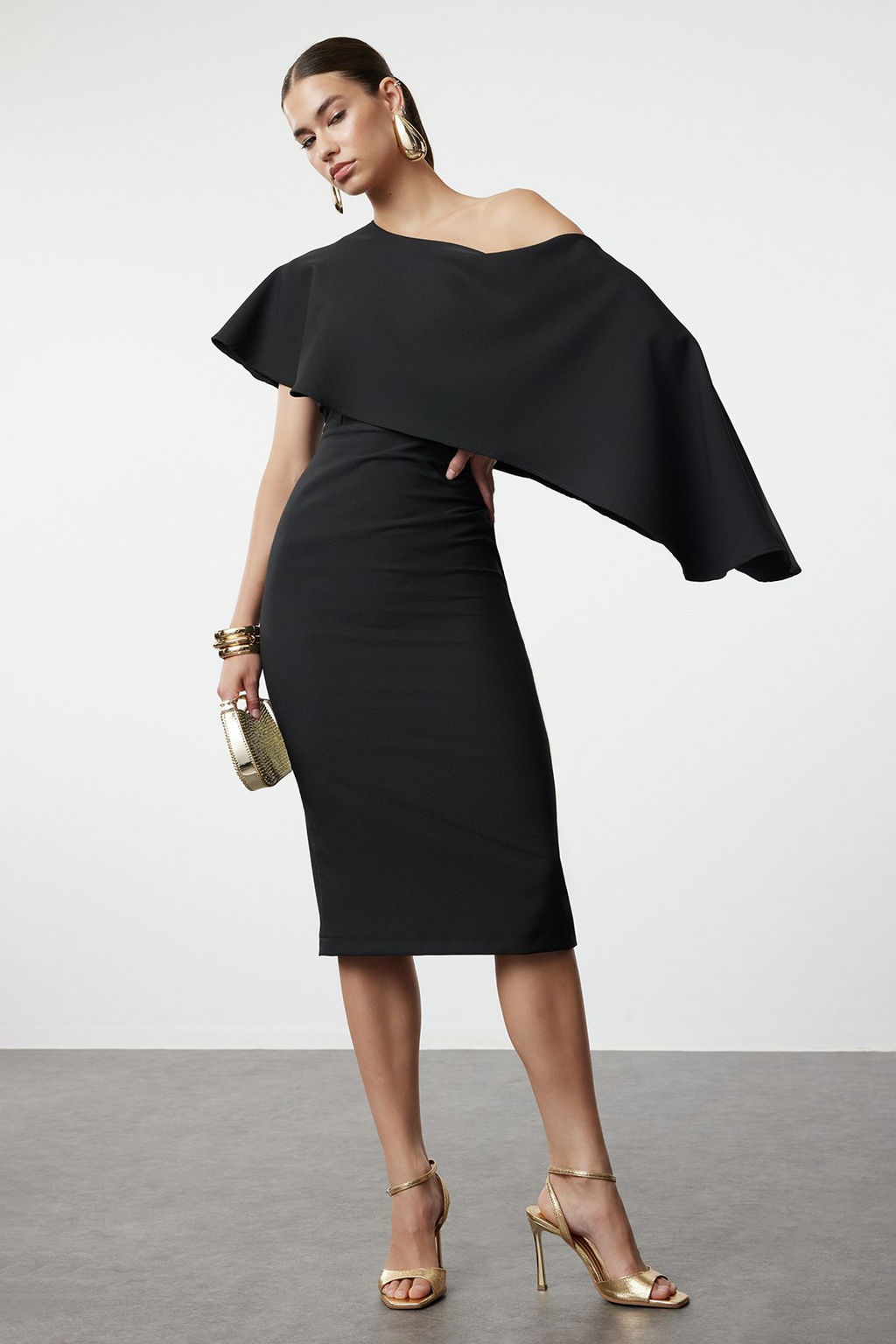 Siyah Vucuda Oturan Pelerin Detayl? Dokuma S?k Abiye Elbise TPRSS24EL00118