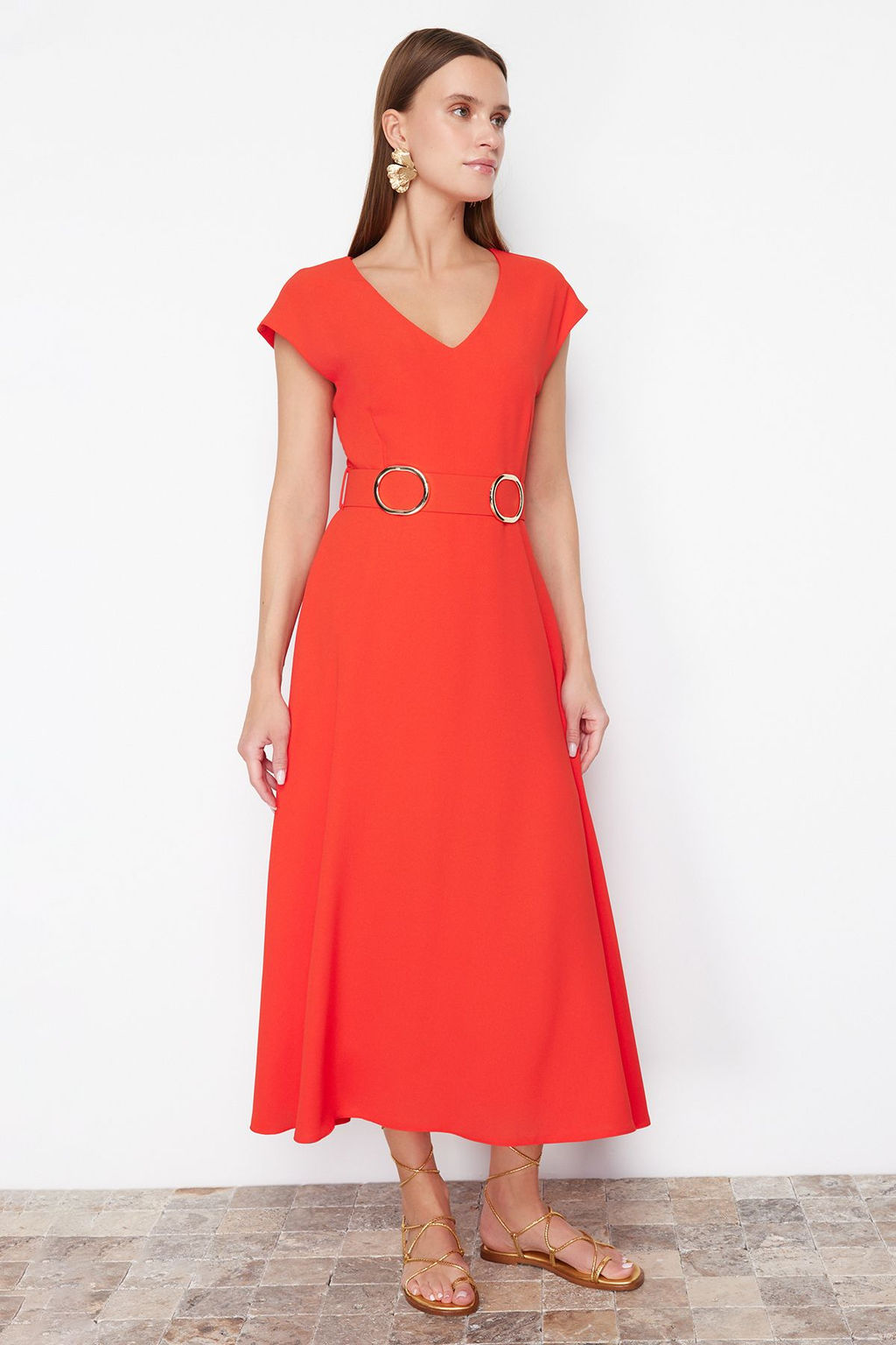 K?rm?z? Kemerli Etegi Belden Ac?lan Midi Krep Dokuma Elbise TWOSS24EL00018