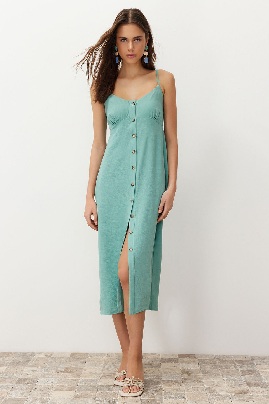 Mint Duz Kesim Dugme Detayl? Midi Dokuma Elbise TWOSS24EL00505