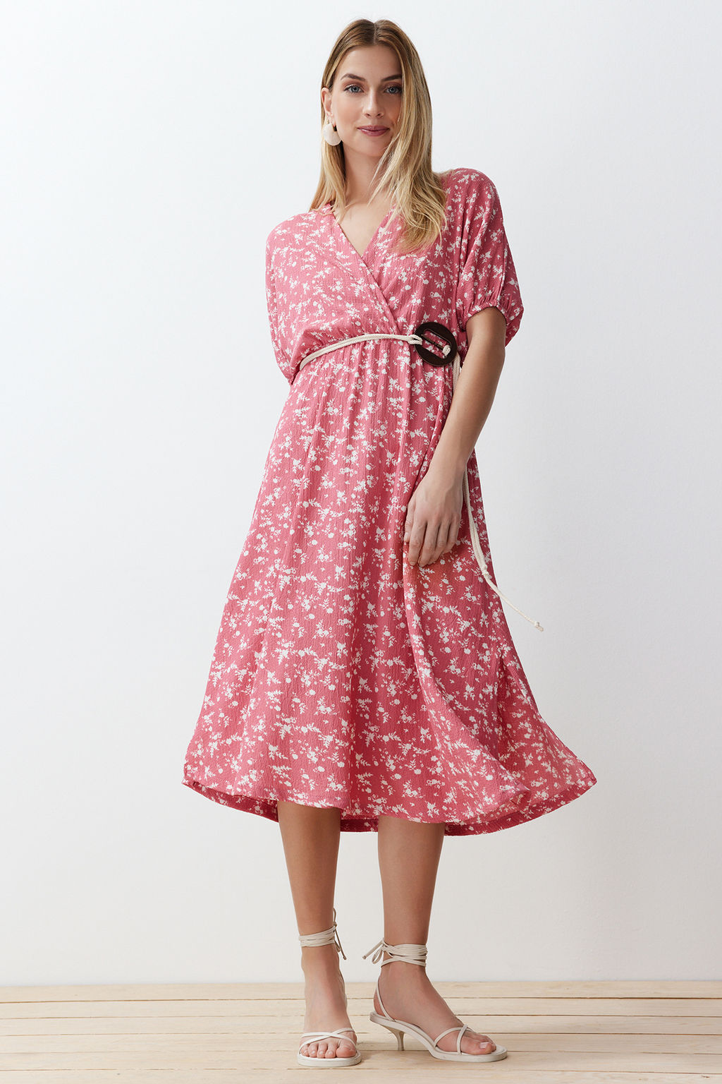 Pembe Bask?l? Aksesuar Kemer Detayl? Buzgulu Esnek Orme Maxi Elbise TWOSS24EL00871