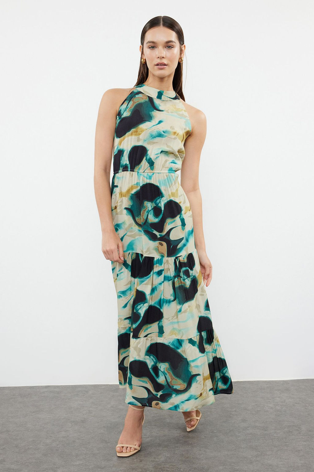 Siyah Soyut Desenli A Kesim Halter Yaka Maxi Dokuma Elbise TWOSS24EL01025