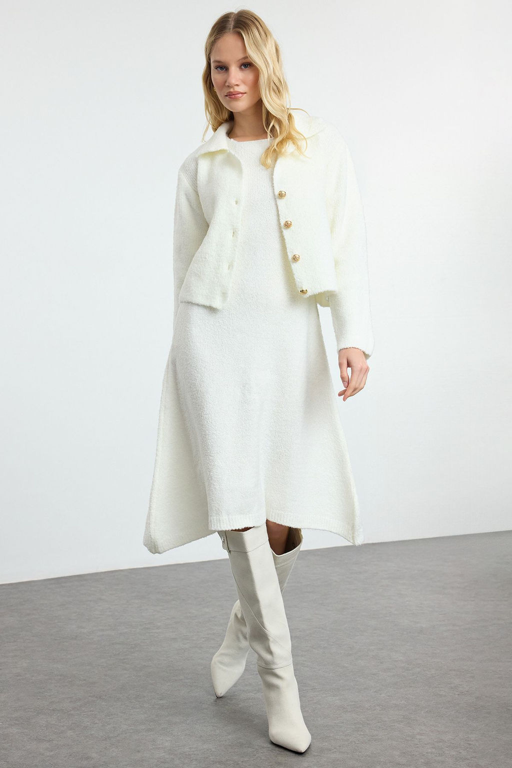 Ekru Midi Triko Ceket Gorunumlu H?rka-Elbise Tak?m TWOAW25EL00082