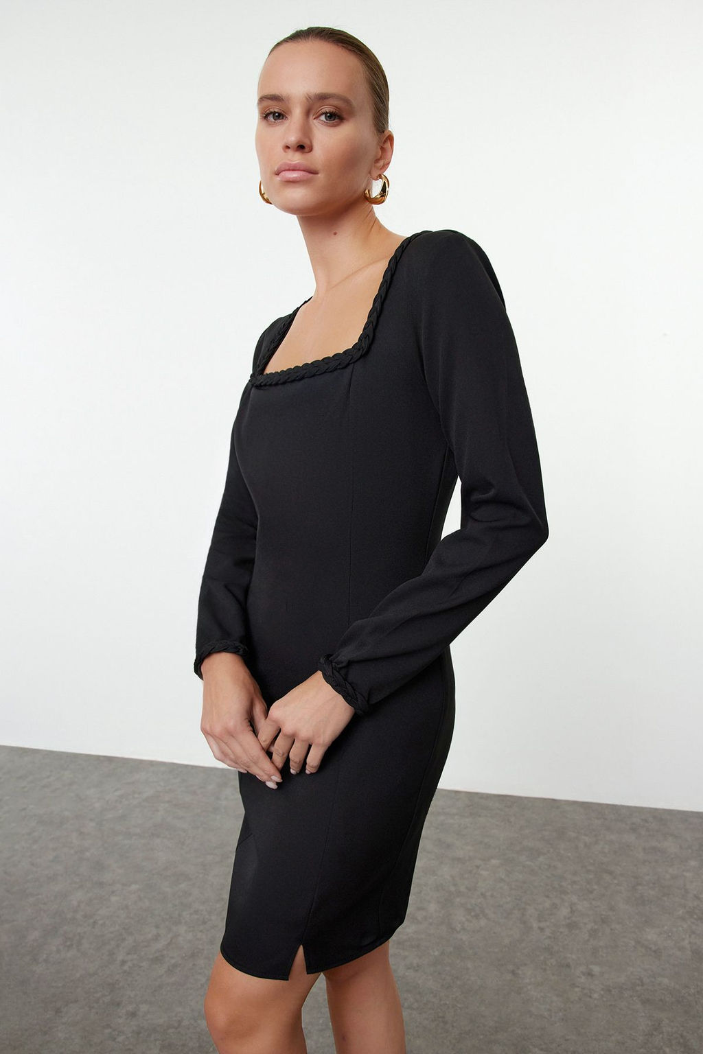 Siyah Vucudu Saran Orgu Detayl? Kare Yaka Mini Dokuma Elbise TWOAW25EL00331