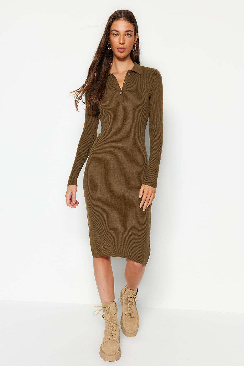 Haki Midi Triko Polo Yaka Elbise TWOAW24EL00029