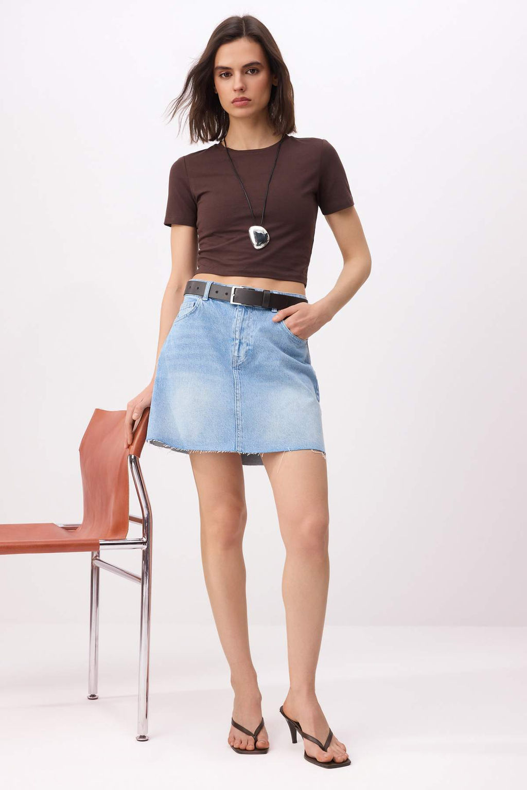 Premium Ac?k Mavi Ozel Kumas Kemerli Az Esnek Mini Denim Etek TWOSS26ET00097