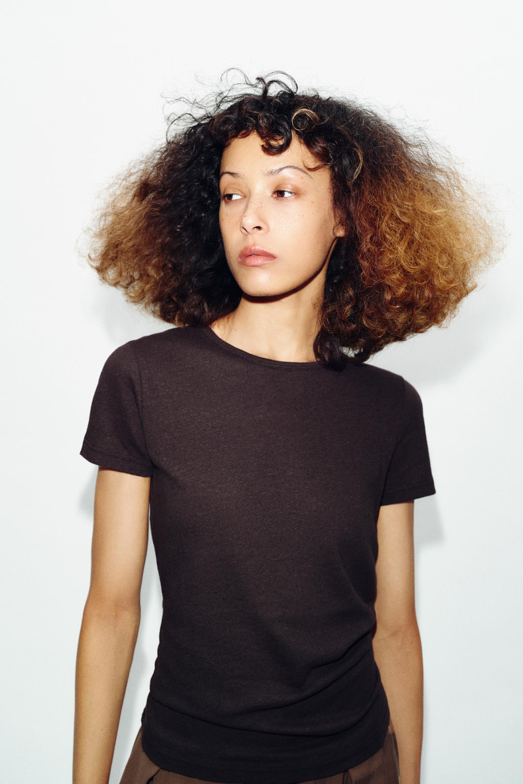 CAMISETA MANGA CORTA CON LINO / Chocolate