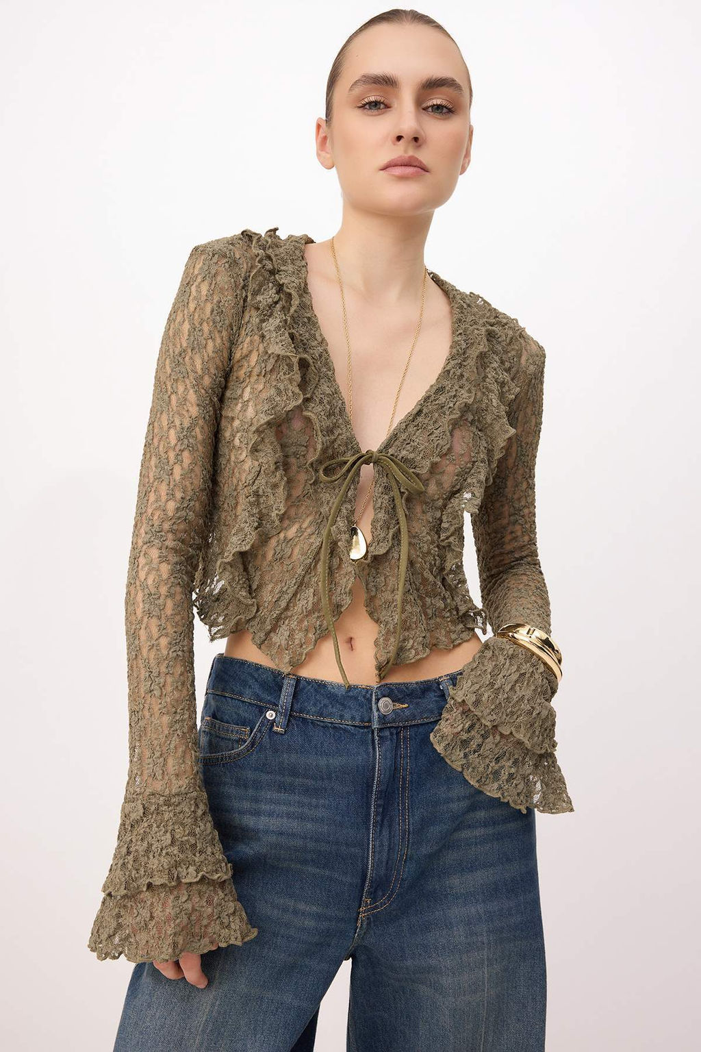 Haki Fitted/Vucuda Oturan Kruvaze Uzun Kollu Volanl?/F?rf?rl? Dantel Orme Bluz TWOSS26BZ00723