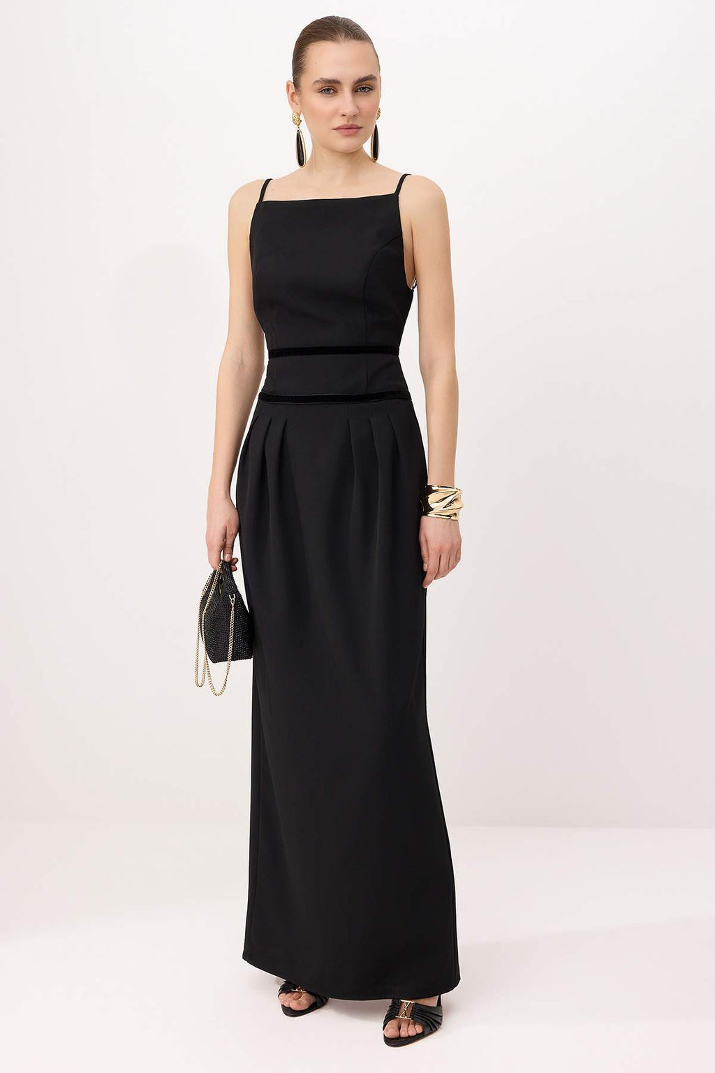 Siyah S?rt Dekolteli Kadife Serit Detayl? Maxi Abiye & Mezuniyet Elbisesi TPRSS26AE00109