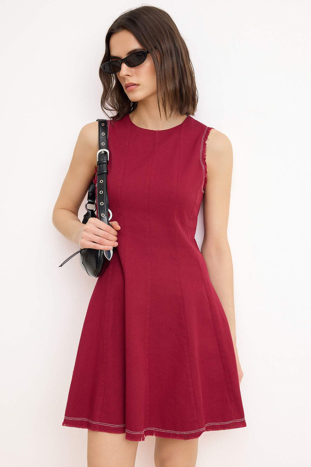 Visne Etegi Volanl? Kolsuz K?sa / Mini Dokuma Elbise TWOSS26EL00423