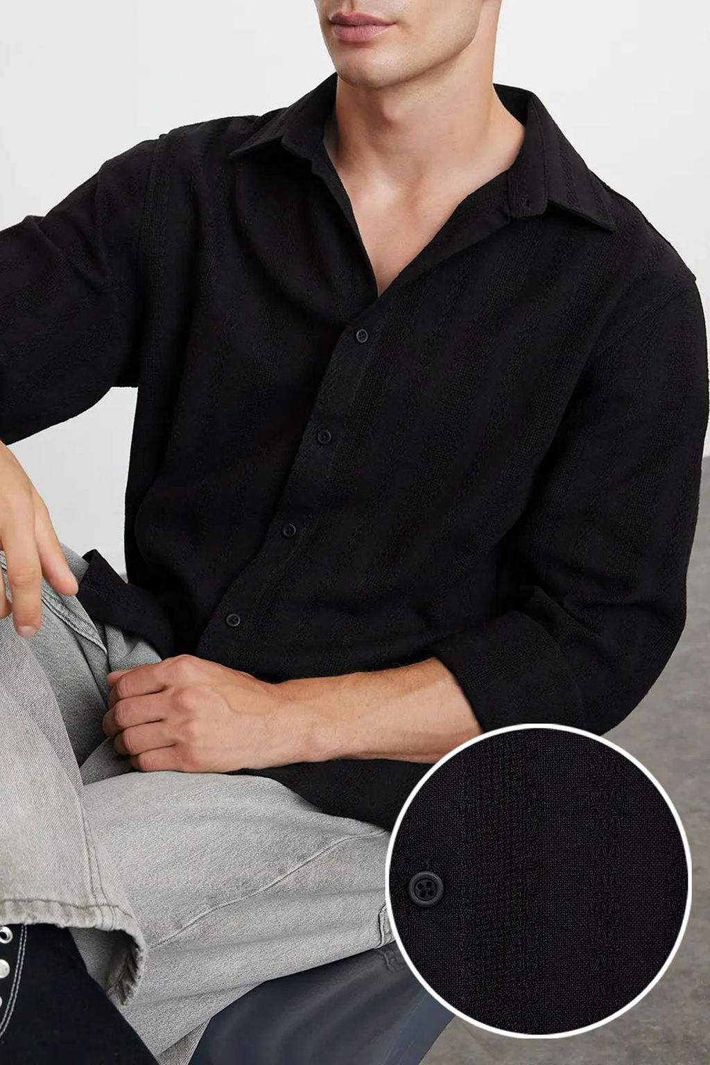 Siyah %100 Pamuk Dokulu Pamuklu Regular Fit K?sl?k Gomlek TMNAW25GO00008