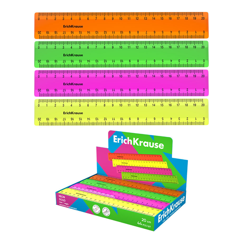 Цена за 44 шт. Линейка пластиковая ErichKrause Neon Solid, 20см, ассорти (в коробке-дисплее по 44 шт)