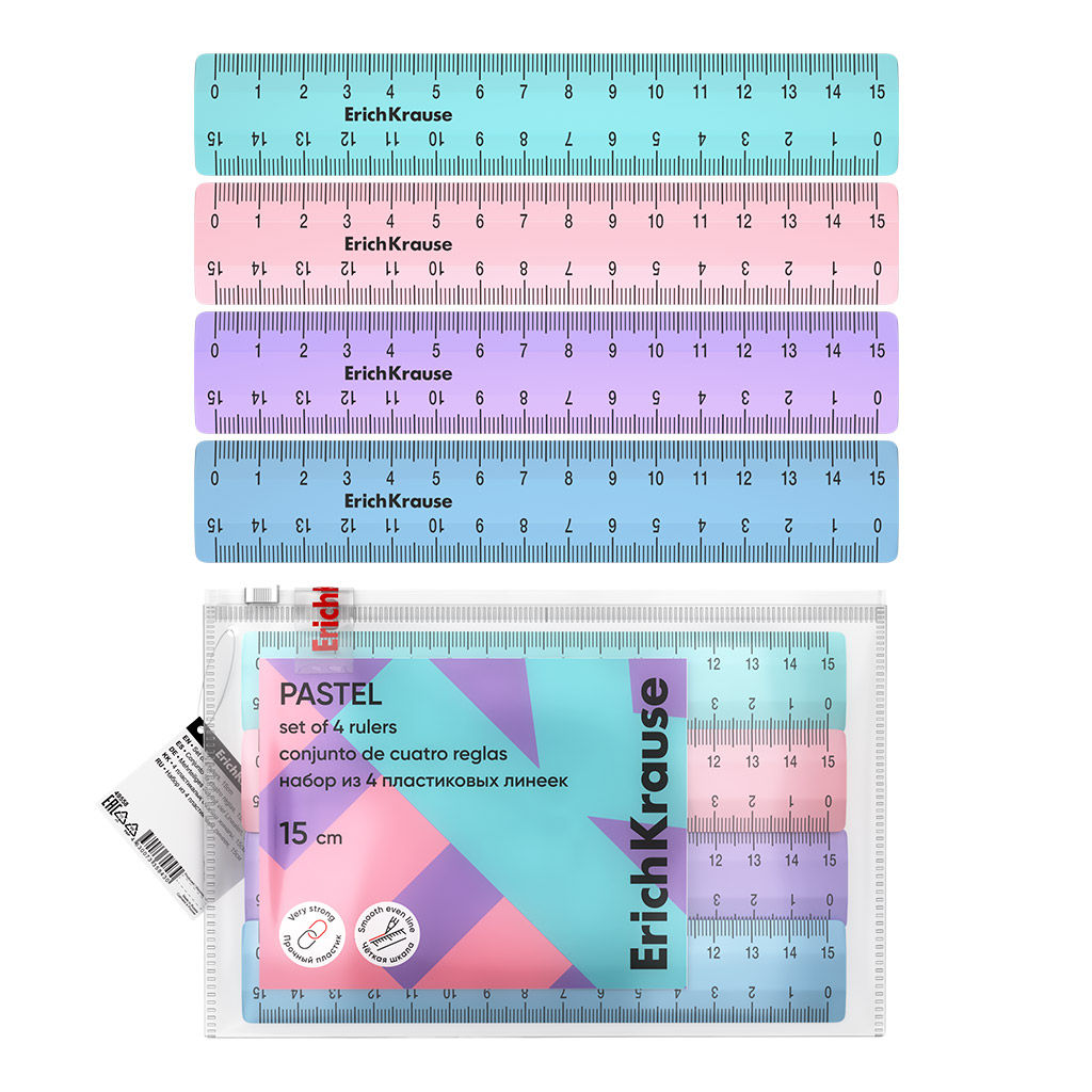 Цена за 20 шт. Набор из 4 пластиковых линеек ErichKrause Pastel, 15см, zip-пакет, ассорти (в пакете по 20 шт)
