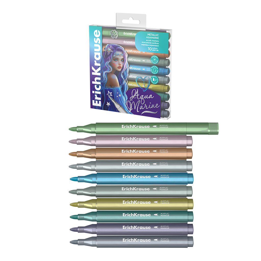 Цена за 12 шт. Цветные маркеры акриловые ErichKrause Aquamarine Metallic c пулевидным наконечником 10 цветов (в ПЭТ-боксе с европодвесом 10 шт)