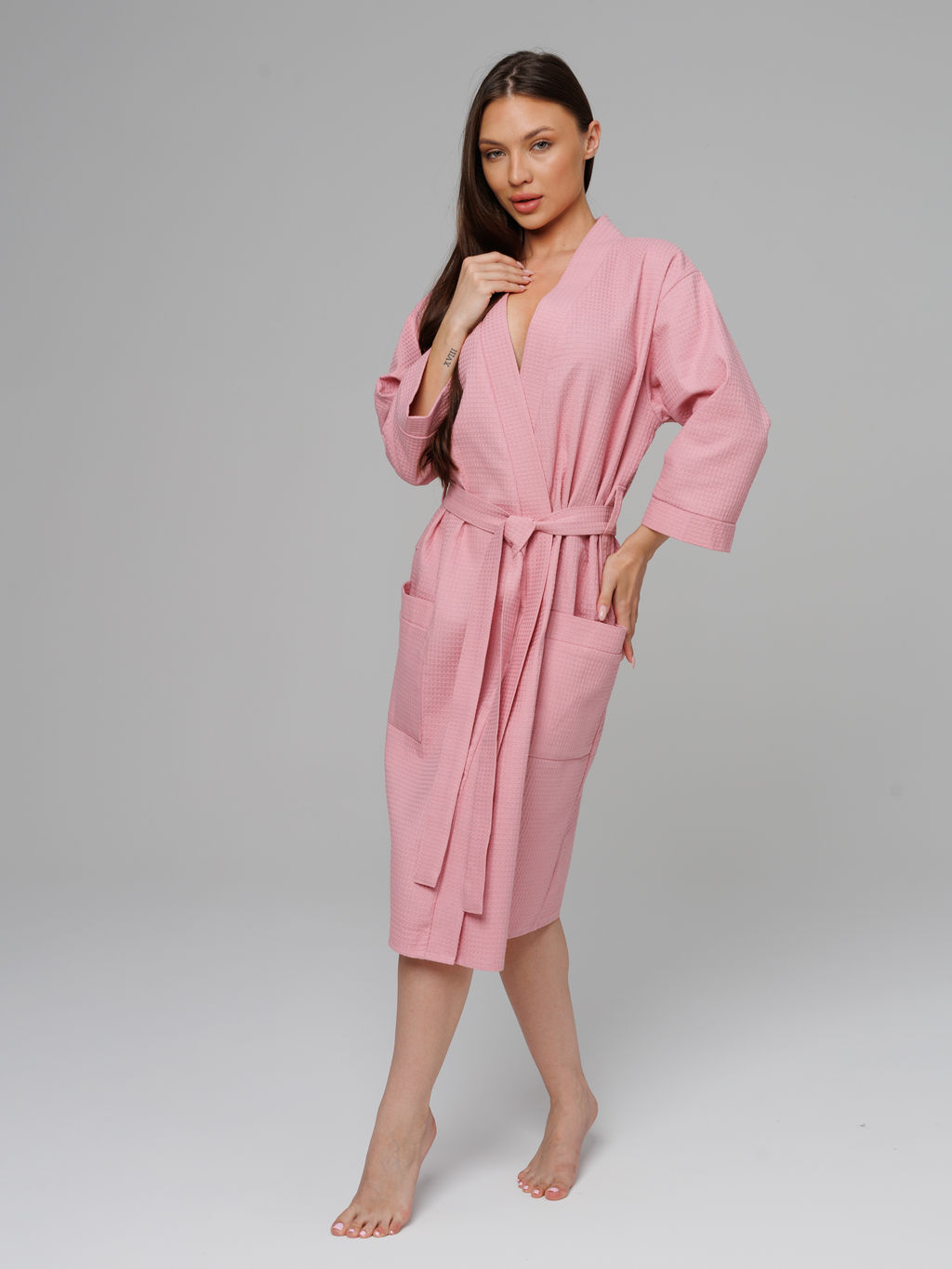 Женский укороченный вафельный халат с планкой пудрово-розовый В-11 (102)