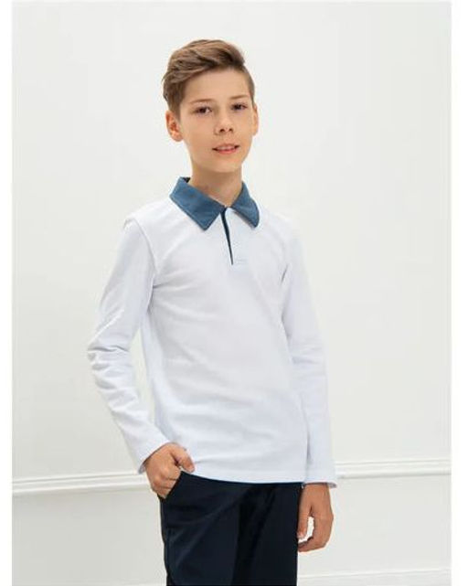 Футболка Поло д/м длинный рукав, цвет белый-серый, 100% х/б