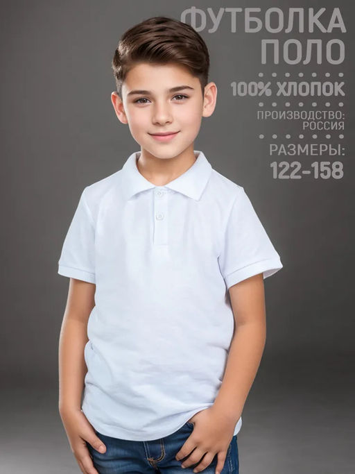 Футболка детская Поло, кор. рукав, цвет Белый, пике карде, 100% х/б