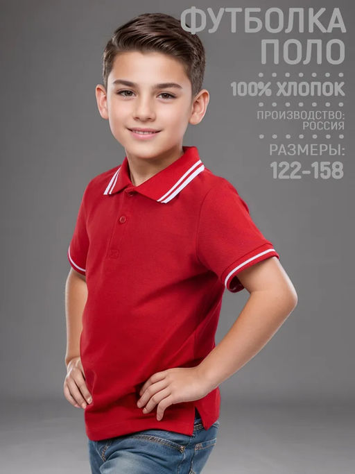 Футболка детская Поло, кор. рукав, цвет Красный, пике карде, 100% х/б