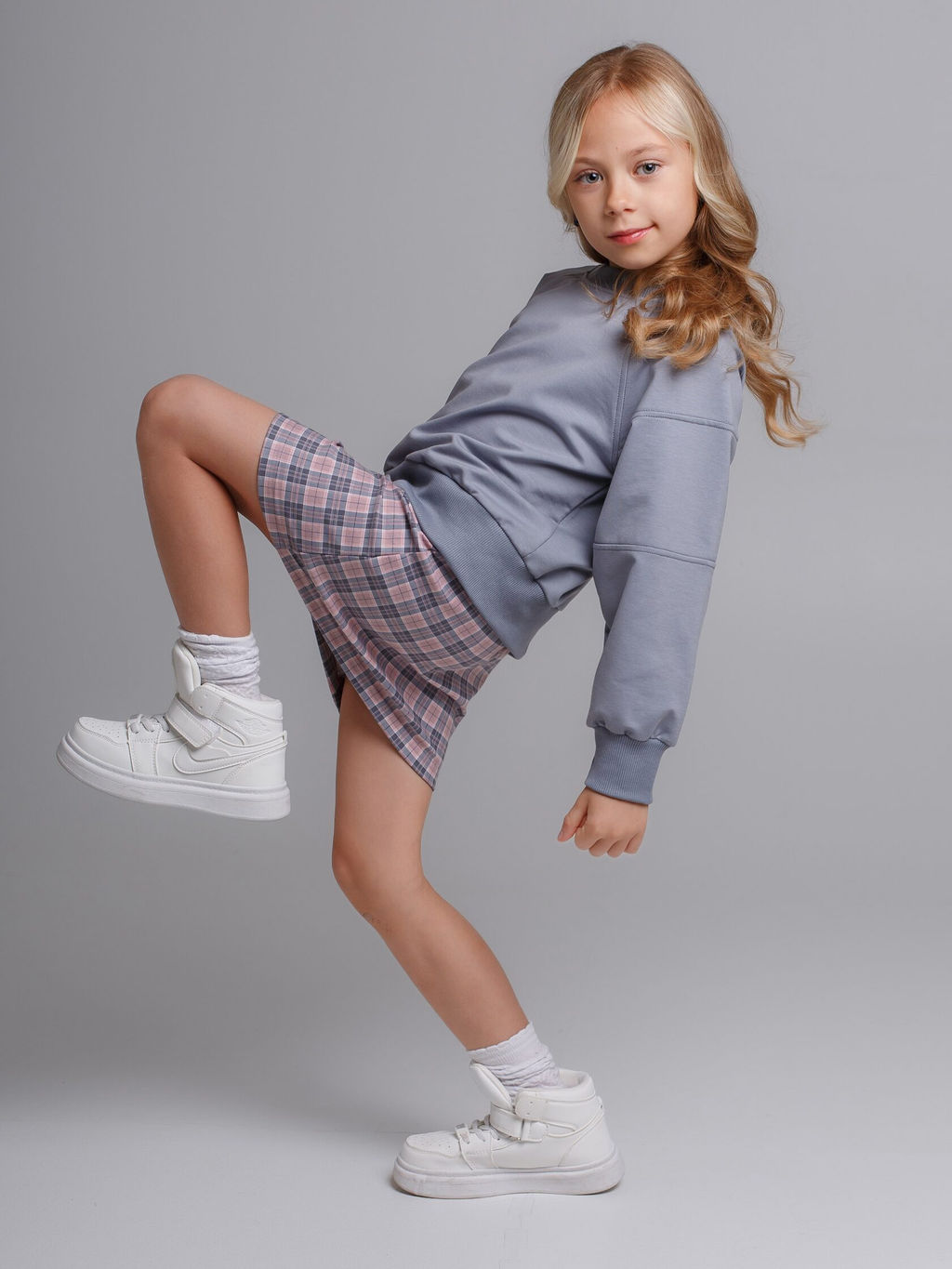 Костюм Мишель(Свит+юбка), ФУ цвет Сер-Роз/Клетка,78%х/б,16%пэ,6%л