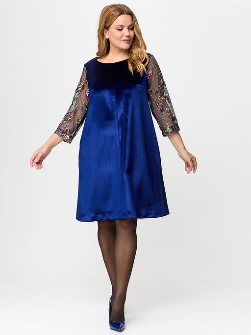 Платье из синего бархата с вышивкой на рукавах