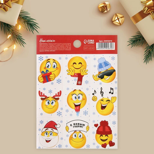 Цена за 10 шт. Наклейки бумажные Новогодние смайлы, 11 15.5 см