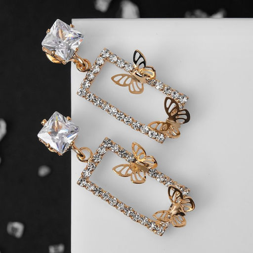 Серьги со стразами "Порхай" бабочки в прямоугольнике, цвет белый в золоте