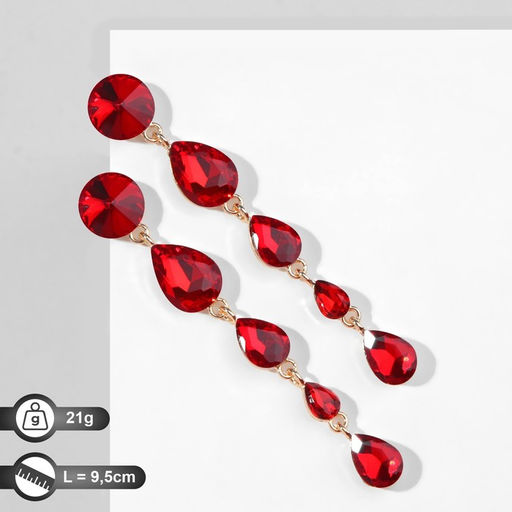 Серьги висячие со стразами "Драгоценность" капли, цвет красный в золоте, 9,5см