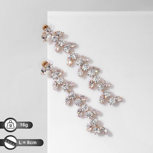 Серьги висячие со стразами "Гроздь" с листьями, цвет белый в золоте, 8см
