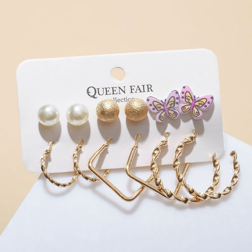 Набор серьги 6 пар "Ассорти" бабочки, цвет бело-розовый в золоте