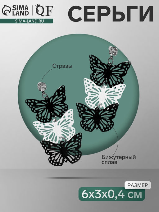 Серьги висячие "Бабочка" трио, цвет чёрно-белый в серебре, 6см