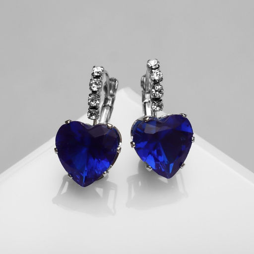 Серьги со стразами "Сердце" мерцание, цвет синий в серебре