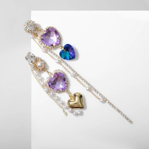 Серьги висячие со стразами "Сердце", цветные в золоте