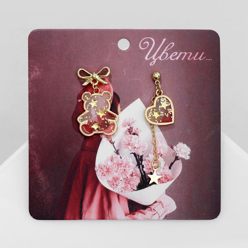 Серьги эмаль "Мишка" и сердце, романтика, цвет бело-розовый в золоте