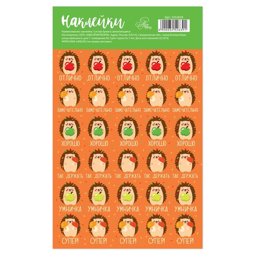Цена за 10 шт. Бумажные наклейки оценки Ёжик, 10,5 х 18 см