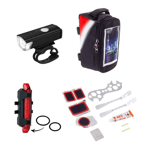 Набор для велосипеда 3 в 1: фонарь аккумуляторный, ремонтный набор, сумка