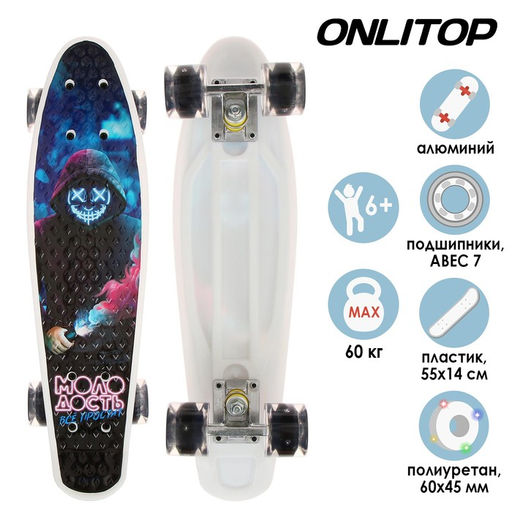 Пенниборд ONLITOP Молодость, 55х14 см, колёса световые PU 60х45 мм, ABEC 7, алюминиевая рама