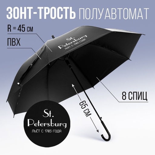 Зонт - трость полуавтомат Питерский дождь, цвет черный, 8 спиц, R = 45 см