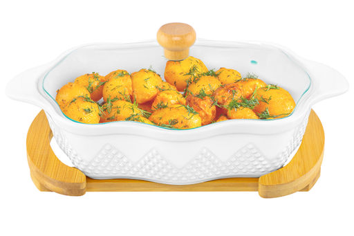 Блюдо д/зап и серв 32*20*14 см 1,5 л "Ромбики" ажур. + стекл крышка, на дер подставке